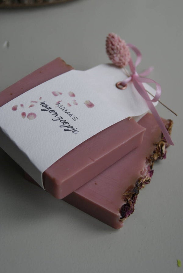 Deze prachtige zeep is handgemaakt en heeft een fantastische geur van rozen. Word standaard geleverd met het roze droogbloemetje en wikkel. Gepersonaliseerde wikkel? Kijk dan hier